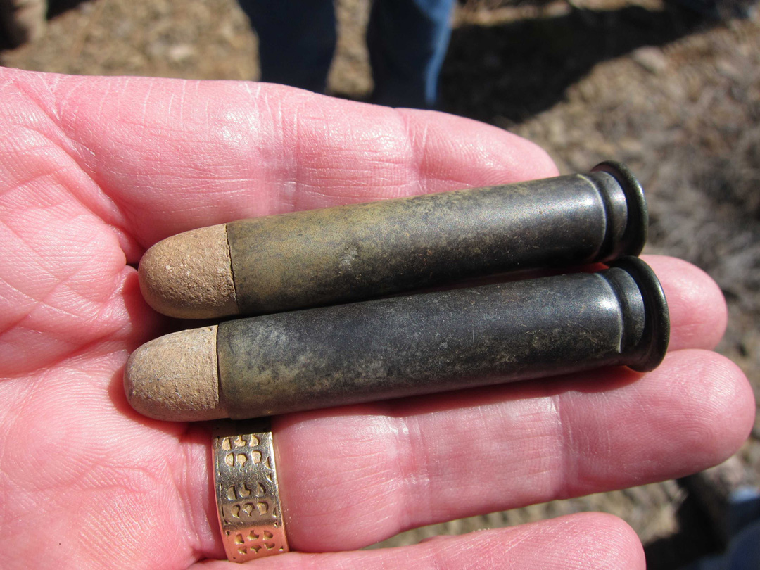 Tour leader Jim Eckles shows the group a couple of intact .45-caliber cartridges found on the battlefield.